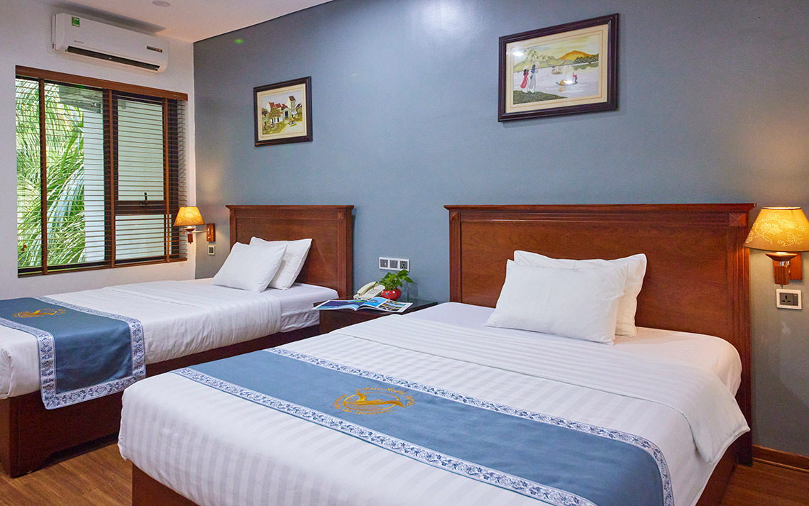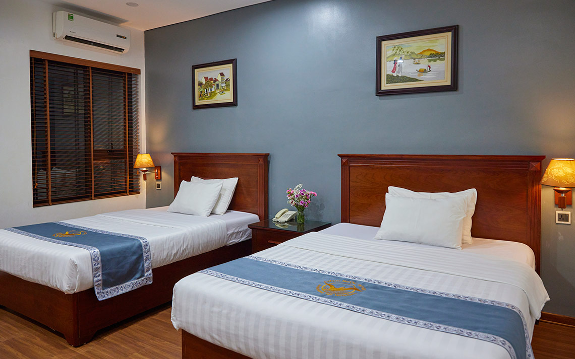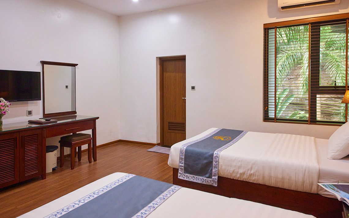 Phòng yên tĩnh và ấm áp có diện tích 23 - 28 m2 với của sổ nhìn ra phong cảnh cây xanh. Phòng được trang bị 2 giường ngủ kích thước 1.3 + 1.5m. Có thể nghỉ cho 3 người lớn + 2 trẻ em với mức phụ thu theo quy định của Khách sạn.